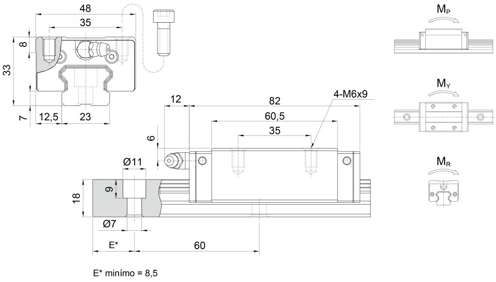 W1 H W Dinâmica (kgf) Estática (kgf) MP (kgf.m) MY (kgf.m) MR (kgf.m) Carro (Kg) Guia (kg/m)