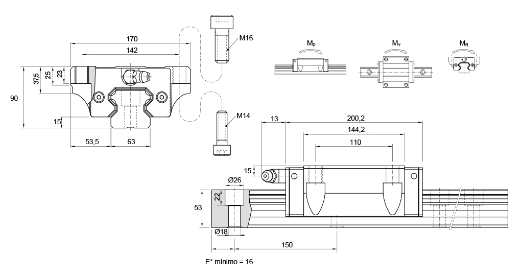 | Dinâmica C (kgf) | Estática C0 (kgf) | MP (kgf.m) | MY (kgf.m) | MR (kgf.m) | Carro kg | Guia kg/m | |